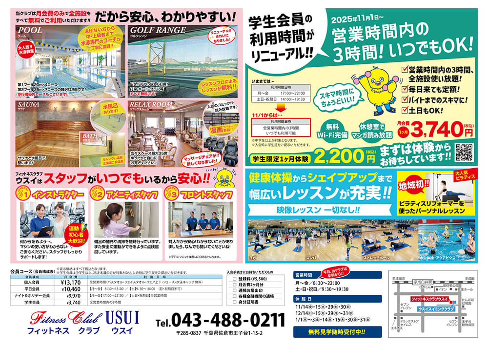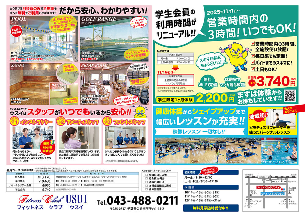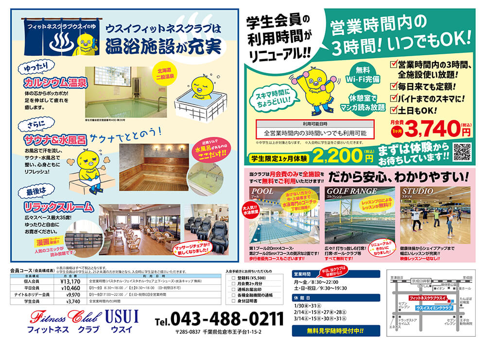 プライバシーポリシー(個人情報保護方針)フィットネスクラブウスイ(以下「当クラブ」)は、以下のとおり個人情報保護方針を定め、全従業員に個人情報保護の重要性の認識と取組みを徹底させることにより、個人情報の保護を推進致します。個人情報の管理 当法人は、お客さまの個人情報を正確かつ最新の状態に保ち、個人情報への不正アクセス・紛失・破損・改ざん・漏洩などを防止するため、セキュリティシステムの維持・管理体制の整備・社員教育の徹底等の必要な措置を講じ、安全対策を実施し個人情報の厳重な管理を行ないます。個人情報の利用目的 お客さまからお預かりした個人情報は、当法人からのご連絡や業務のご案内やご質問に対する回答として、電子メールや資料のご送付に利用いたします。個人情報の第三者への開示・提供の禁止 当法人は、お客さまよりお預かりした個人情報を適切に管理し、次のいずれかに該当する場合を除き、個人情報を第三者に開示いたしません。・お客さまの同意がある場合・お客さまが希望されるサービスを行なうために当社が業務を委託する業者に対して開示する場合・法令に基づき開示することが必要である場合ご本人の照会 お客さまがご本人の個人情報の照会・修正・削除などをご希望される場合には、ご本人であることを確認の上、対応させていただきます。法令、規範の遵守と見直し 当法人は、保有する個人情報に関して適用される日本の法令、その他規範を遵守するとともに、本ポリシーの内容を適宜見直し、その改善に努めます。個人情報の管理 当法人が収集した個人情報を適切に漏洩防止のために安全対策を講じます。