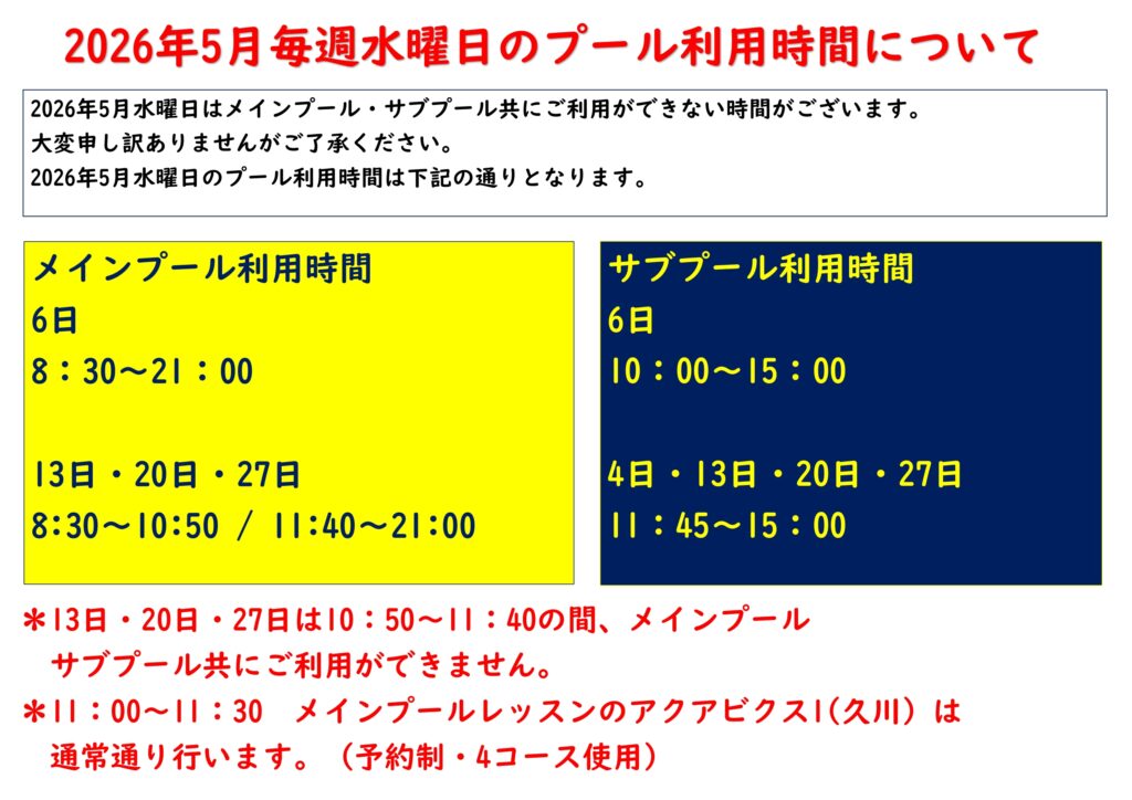 2026年5月毎週水曜日のプール利用時間について